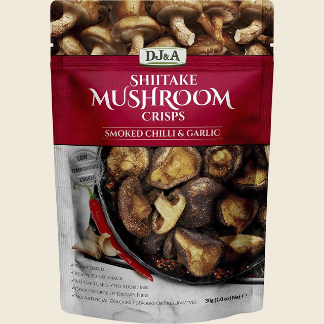 DJ&A Shiitake Mushroom Crisps Smoked Chilli & Garlic feature bold smoky seasoning paired with naturally savoury shiitake mushrooms for a flavour-packed, plant-based snack.