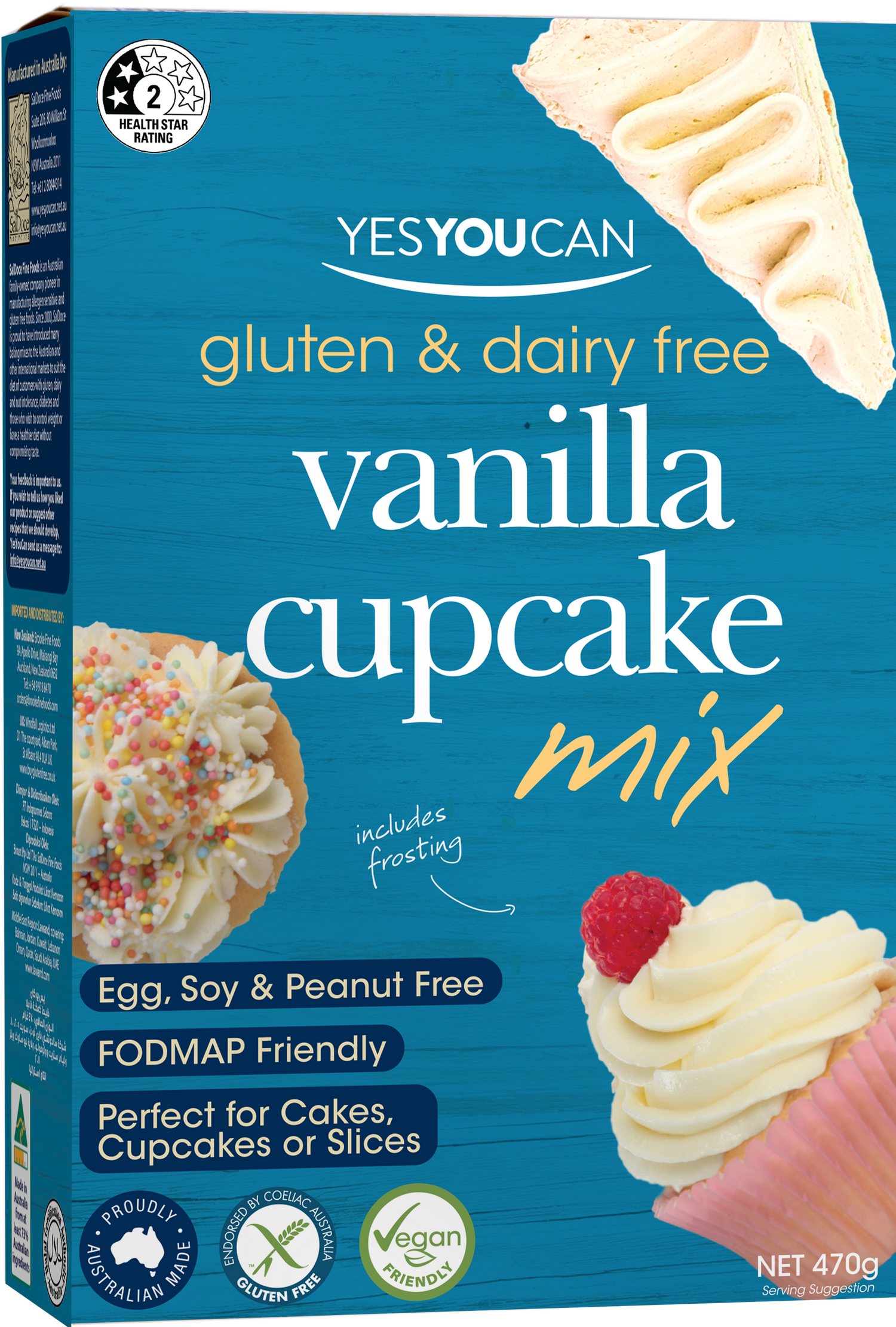 YesYouCan Vanilla Cupcake Mix 470g is a gluten free and dairy free baking mix that includes frosting. It’s egg free, soy free, peanut free and suitable for those following a low FODMAP or vegan lifestyle. Perfect for baking soft, fluffy cupcakes, slices or even a full vanilla cake — all from one versatile mix.