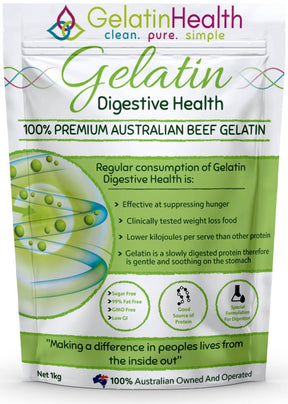Gelatin Health – Digestive Health Gelatin 1kg is made from 100% premium Australian beef gelatin, designed to gently support digestion and satiety. This slowly digested protein is soothing on the stomach and ideal for use in healthy cooking, baking, or daily wellness routines.