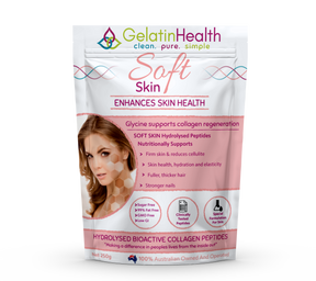 Gelatin Health Soft Skin Collagen is pure protein that strengthens skin, hair and nails. Collagen is the protein essential for supporting the integrity of the skin. It tightens the skin and is anti-aging.