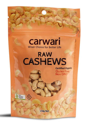 Carwari Organic Cashews – Raw (150 g) are premium organic cashews with a naturally rich, buttery flavour. Enjoy straight from the pack or use in cooking, baking, muesli, salads and homemade nut milks or butters.