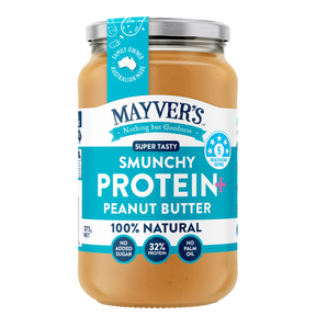 Enjoy the rich & intense flavour of natural peanuts which have been roasted to perfection then crushed and blended with reduced fat peanut flour and a 'lil touch of sea salt. Mayver's Protein + Peanut Butter boasts 32% protein in every serve. This spread contains no added oil, dairy, sugar, hardened fats, stabilisers or added sugar & is made from pure ingredients with have simply been crushed & bottled.