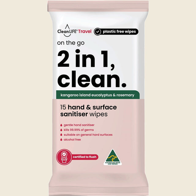 CleanLife 2 In 1 Plastic Free Wipes Hand and Surface Sanitiser 15pk
