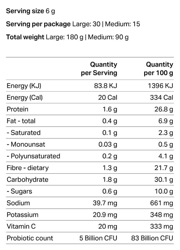 Serving size: 6 g • Servings per package: Large 30 • Total weight: Large 180 g