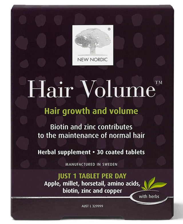 New Nordic Hair Volume Herbal Supplement nourishes hair from within with apple extract, millet, horsetail, biotin, zinc, copper and amino acids for thicker, fuller-looking hair.