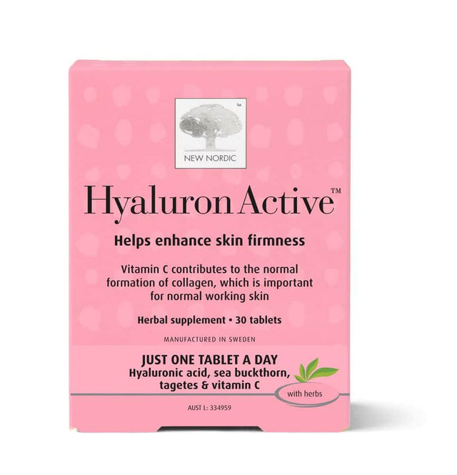 New Nordic Skin Care Hyaluronic Active 30 Tablets supports skin fullness and elasticity from within with hyaluronic acid, vitamin C and Nordic botanicals.