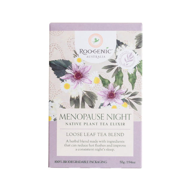 Roogenic Menopause Night Tea is a calming, naturopath-designed herbal infusion crafted to support restful sleep and reduce discomfort caused by menopausal symptoms at night. Featuring a thoughtful combination of sleep-promoting and hormone-balancing botanicals, this caffeine-free blend is the ideal addition to your evening wellness routine.