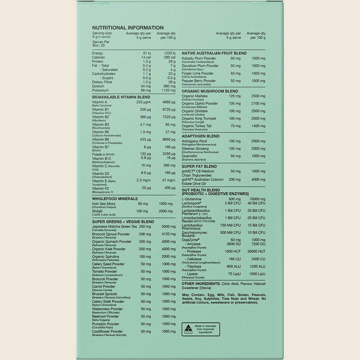 Ingredients (blends per 5 g serve)