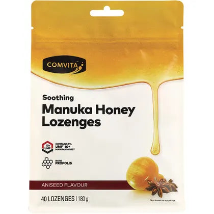 Enhance your throat comfort with the soothing and refreshing Comvita Manuka Honey Lozenges Aniseed. Order your pack of 40 lozenges today and experience the combined benefits of premium Manuka honey and invigorating aniseed flavor!