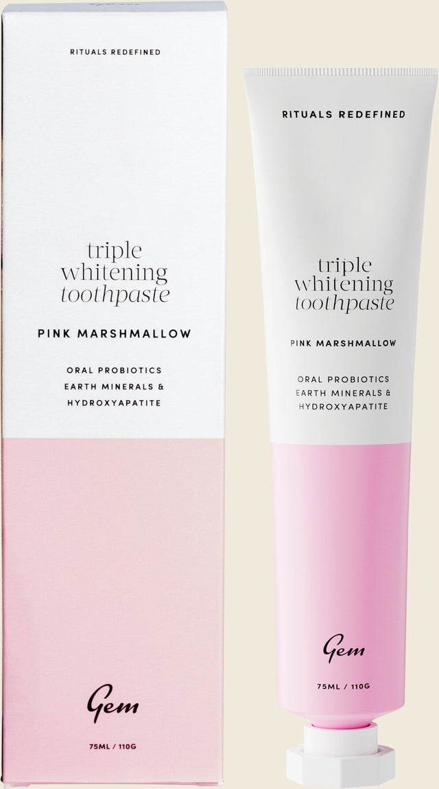 Gem Triple Whitening Toothpaste – Pink Marshmallow (110 g) pairs a fun pink-marshmallow flavour with enamel-supporting hydroxyapatite, gentle polishing minerals and oral probiotics for a fresh, bright clean.
