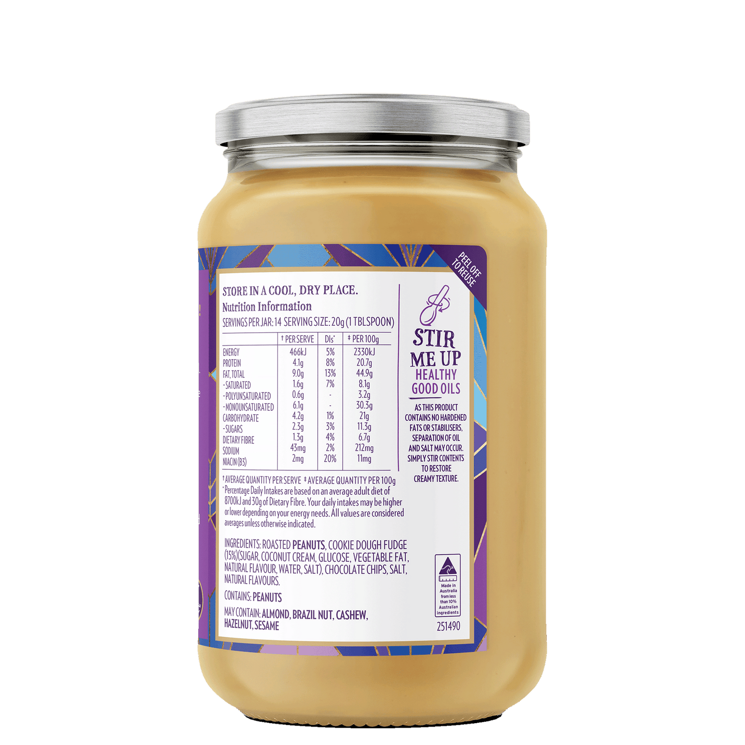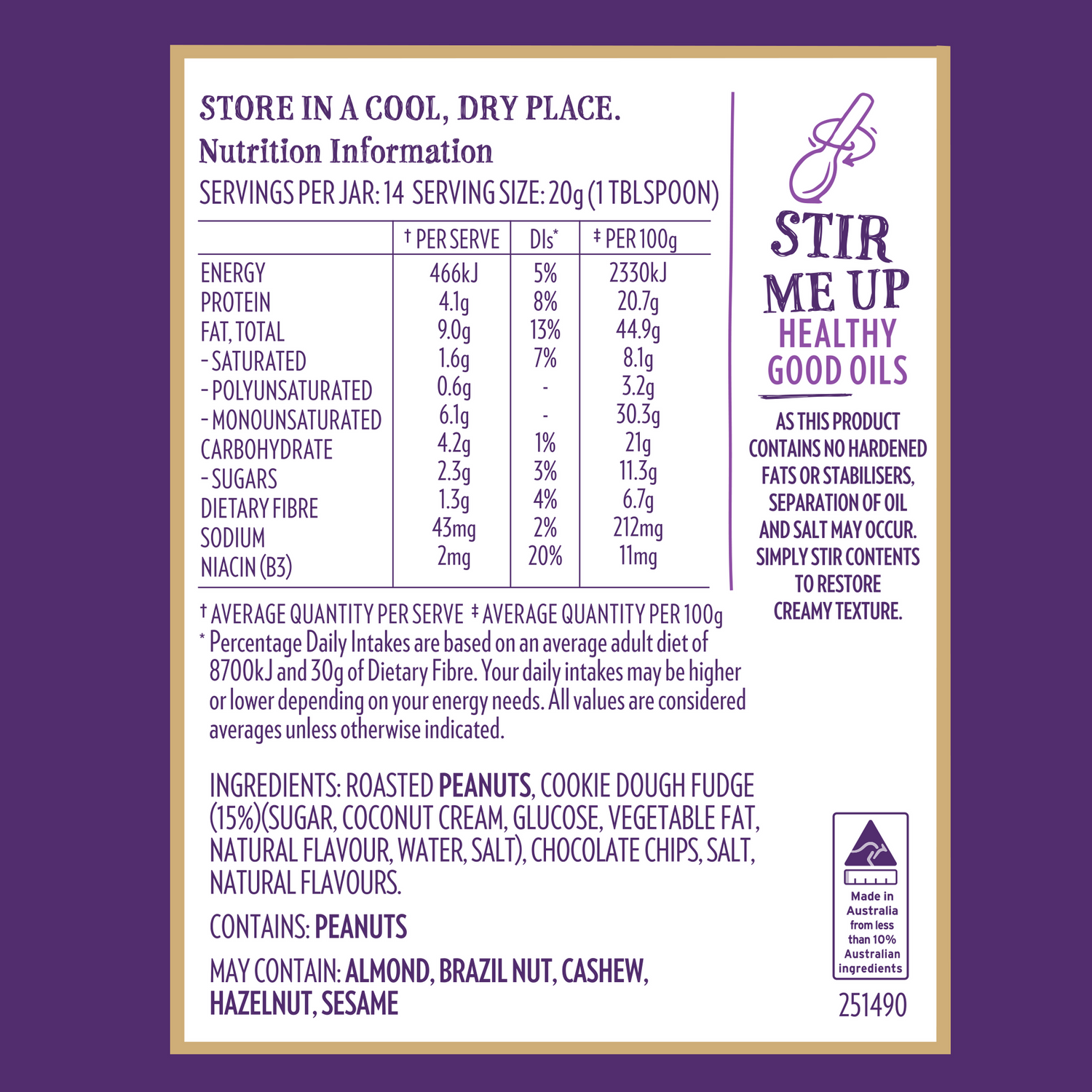 Roasted Peanuts, Cookie Dough Fudge (15%) (Sugar, Coconut Cream, Glucose, Vegetable Fat, Natural Flavour, Water, Sea Salt), Chocolate Chips, Sea Salt, Natural Flavours.