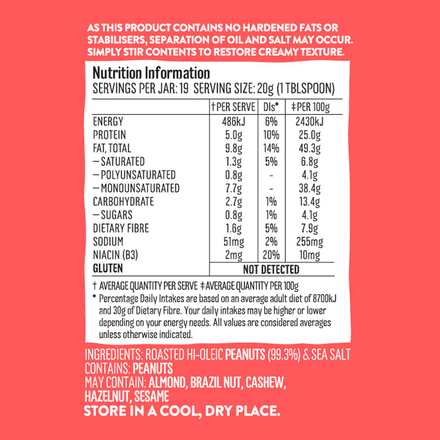 Like all our other natural Peanut Butters, it contains absolutely no added oil, sugar, gluten, dairy, cholesterol or hardened fats. The peanuts are carefully selected then lightly roasted, mixed with the finest sea salt and ground to perfection giving it a naturally sweet tasting, crunchy texture with a tiny zing.
