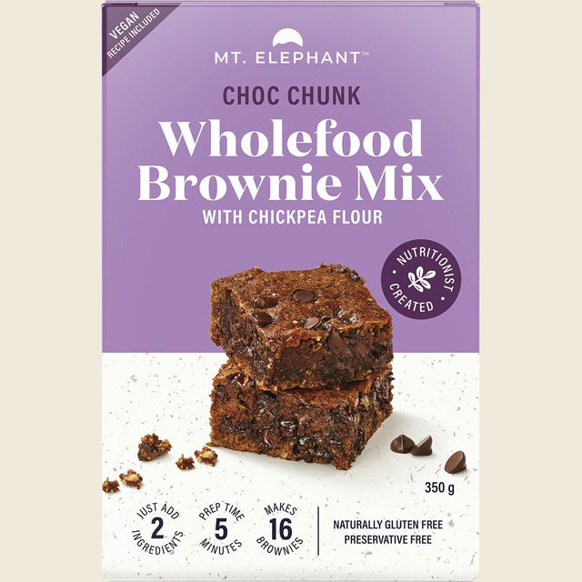Mt. Elephant Wholefood Brownie Mix Choc Chunk 350g bakes rich, fudgy brownies studded with chocolate chunks for deep cocoa satisfaction.
