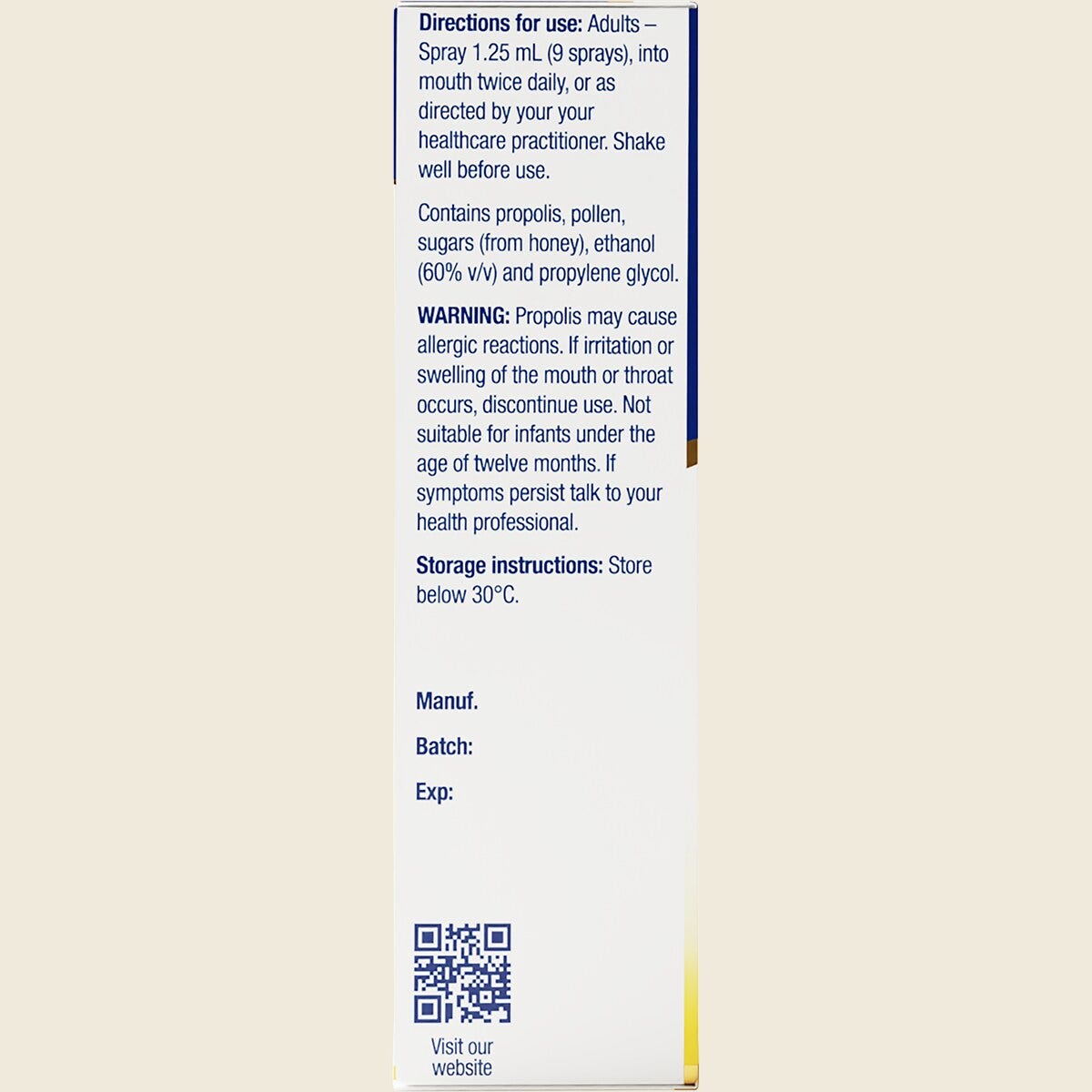 - Contains Propolis (200mg/ml) and Manuka Honey (MGO 280+ 200mg/ml).