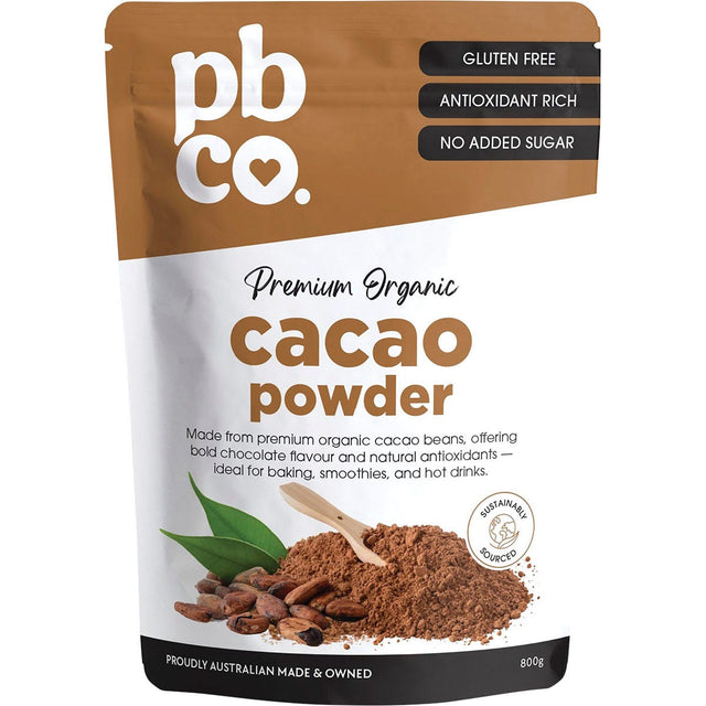 PBCo. Organic Cacao Powder 800g is ideal for avid bakers and chocolate enthusiasts. This bulk pack provides rich, aromatic, and nutrient-packed cacao sourced from sustainable farms, delivering deep chocolate flavour with no additives—just pure, natural cacao.