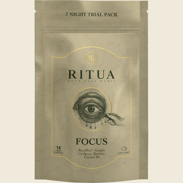 Ritua FOCUS Trial Pack BacoMind Ginkgo Cordyceps Tyrosine B6 14 Capsules is a convenient way to try Ritua’s focus-forward capsule formula for study or work periods.